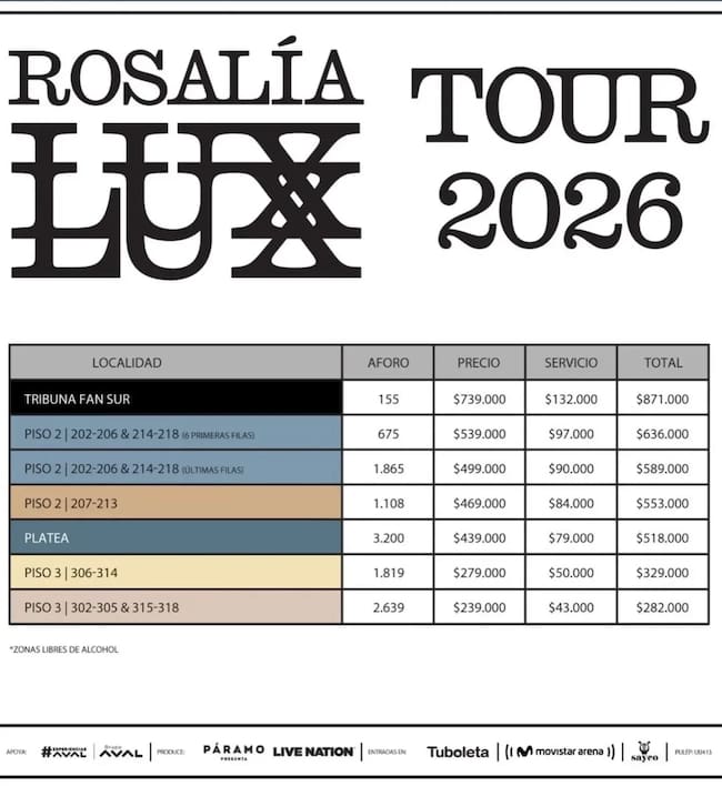 Los siguientes son los precios de la boletería para el concierto de Rosalía, incluyendo el costo del servicio