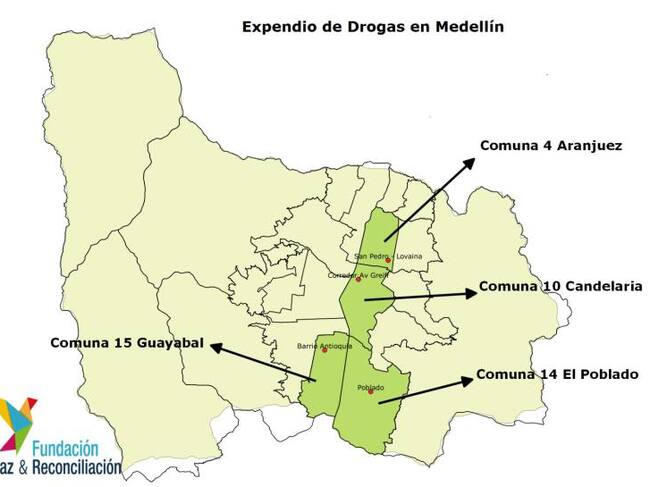 La lista es encabezada por la comuna 15 – Guayabal, según la organización sin ánimo de lucro, en el barrio Antioquia es histórico el expendio de estupefacientes, "uno de los más grandes de la ciudad".