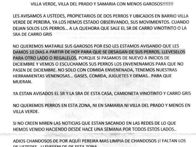 Ya no es un caso atípico lo que se ha venido presentando en algunos sectores de la ciudad con los envenenamientos de perros, pues ahora en el barrio Villa Verde la comunidad está en alerta debido a que han llegado cartas anunciando que deben retirar sus mascotas antes de 10 días pues de lo contrario se las envenenarán.