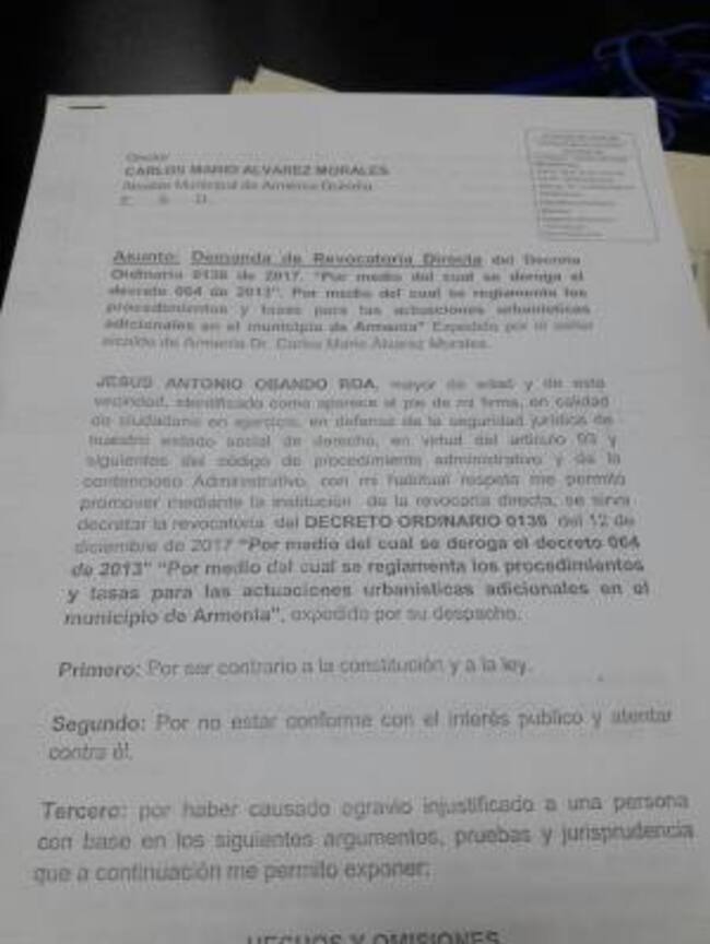 Jesús Antonio Obando presentó ante el alcalde de Armenia, Carlos Mario Álvarez demanda directa de revocatoria del decreto 0136 por medio del cual derogó el decreto 064 del 2013 relacionado con las compensaciones urbanísticas en la ciudad.