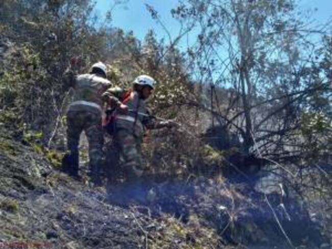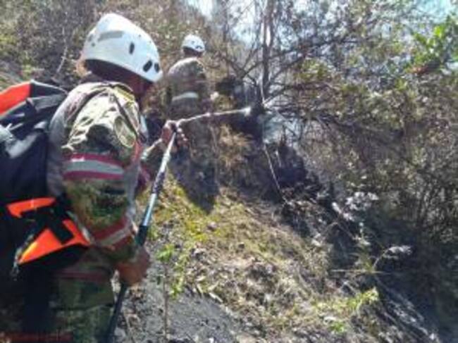 Al tiempo trabaja un helicóptero de la Fuerza Aérea Colombiana tipo Bambi Bucket, quien realiza descargas de agua en altura sobre las zonas con más focos de calor para intentar controlar la emergencia.