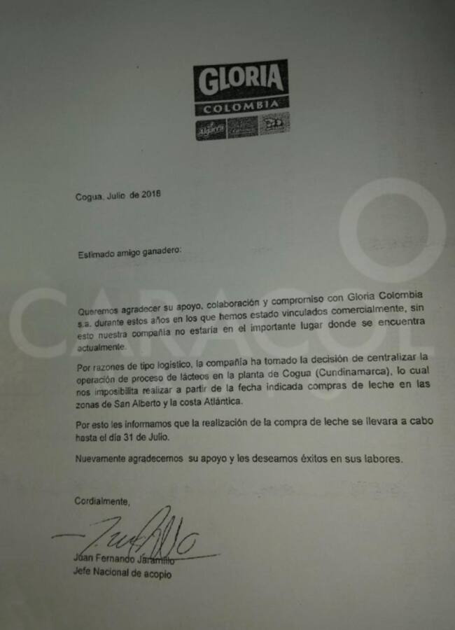 Justo a finales del mes de julio del presente año, los lecheros recibieron el comunicado donde la compañía Gloria Colombia S.A, les señaló que a partir del miércoles 1 de agosto, no les comprará más producto.