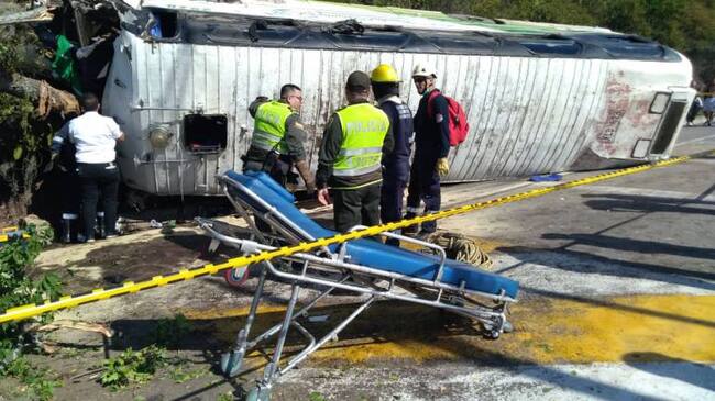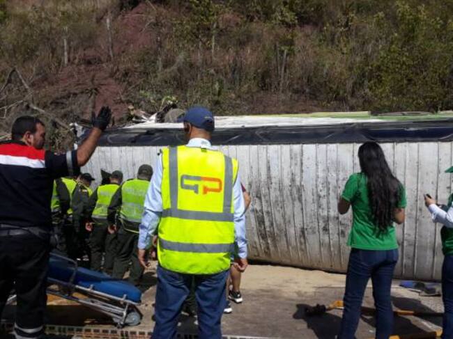 El bus una vez pasó el peaje, se accidentó a pocos metros y presenta volcamiento lateral en una de las cunetas que hay en ese tramo vial.