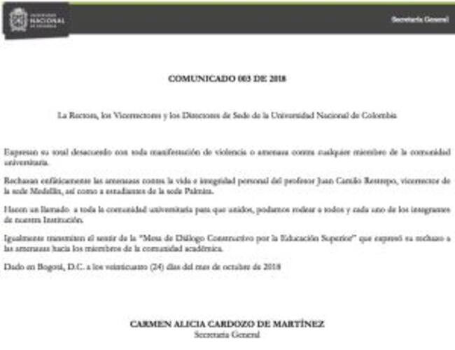Las directivas de la Universidad Nacional sede Medellín denunciaron, que el Vicerrector y la Decana de la Facultad de Minas recibieron amenazas de muerte mediante llamadas telefónicas, situación que fue informada mediante un comunicado oficial.