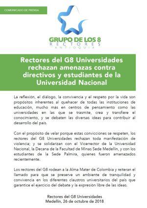 El grupo de los ocho rectores de Antioquia se solidarizaron con los directivos de la Universidad Nacional sede Medellín, Amenazados por desconocidos. Y rechazaron las intimidaciones contra representantes de la educación en el país.