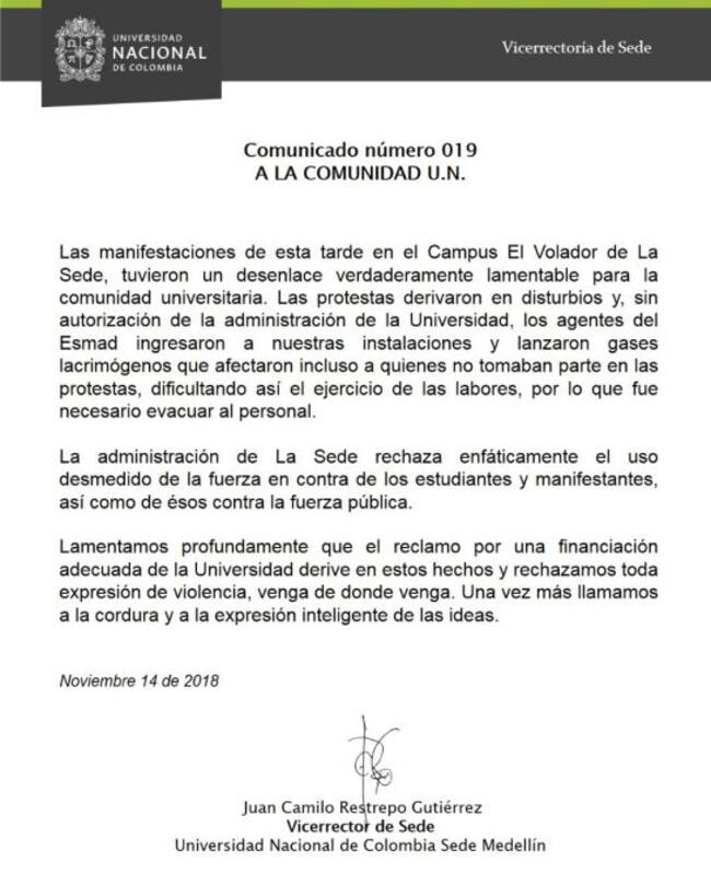 4. Instamos a todos los organismos e instancias defensoras y garantes de los derechos humanos en la ciudad de Medellín y en Colombia a activar y alertar a la sociedad Nacional e internacional de los desmanes y la violencia sistemática que estamos sufriendo por parte del ESMAD, así mismo, responsabilizamos del Ingreso y atropello del ESMAD a nuestro Campus a Juan Camilo Restrepo Gutiérrez, Vicerrector de la Sede Medellín, a la Rectora, Dolly Montoya y al Presidente de la República, Iván Duque Márquez.