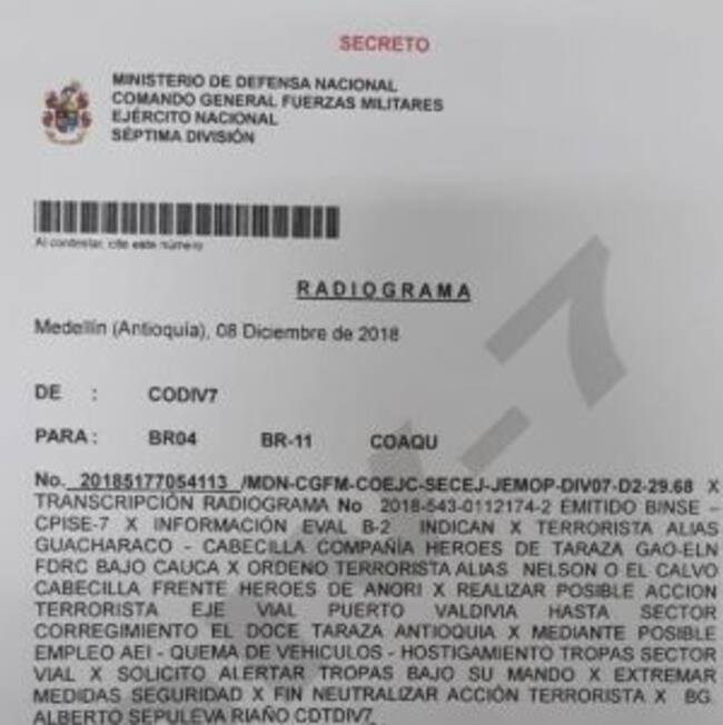 La misiva ordenaba tomar acciones urgentes y extremar las medidas de seguridad para contrarrestar los actos terroristas de la guerrilla del ELN.