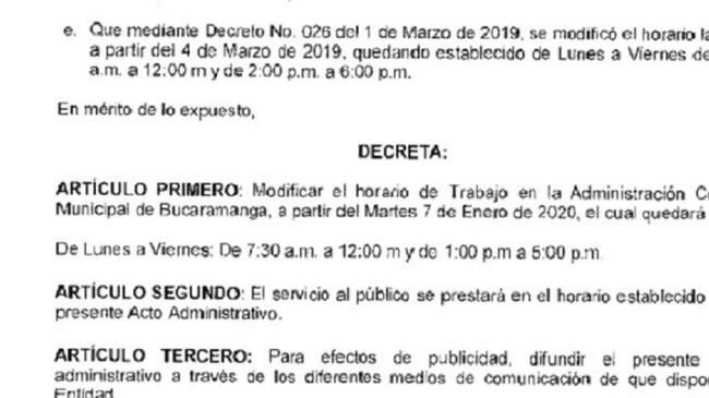 Así quedó establecido en el Decreto 0009 del 2 de enero de 2020, emitido por el mandatario local, Juan Carlos Cárdenas, el cual establece la modificación del horario laboral de los servidores públicos en la Administración Central Municipal.