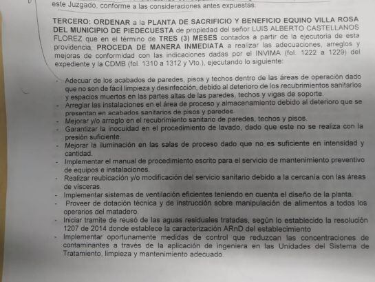Sin embargo, el juez le otorga un término de tres meses al propietario de la planta de sacrificio equino, Luis Alberto Castellanos Flores, para que haga unas adecuaciones dadas por el Invima para que funciona la planta, como son: