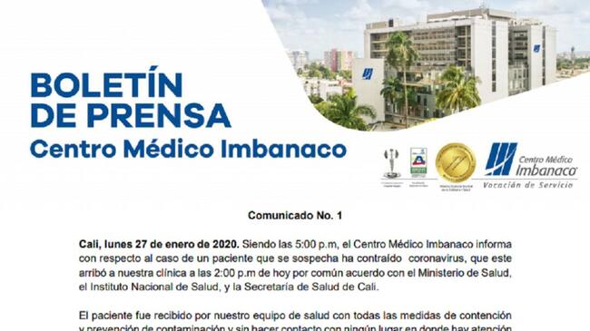 El centro médico Imbanaco, emitió un comunicado en el que confirma la llegada de un paciente, del cual se sospecha habría contraído el coronavirus.