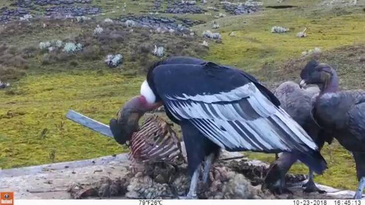 En el video se captó a cuatro cóndores entre ellos dos hembras adultas alimentándose de un oveja. Una de ellas tenían una especie de anillo en su pata lo que comprometía su estado de salud.