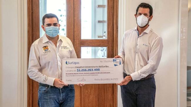 La entrega protocolaria de los recursos se realizó a través de un cheque simbólico por parte de Santiago Mejía al Gobernador de Bolívar. También estuvieron presentes en este espacio la directora de la Fundación Surtigas, María Claudia Trucco y el Agente Interventor del Hospital Universitario. Felipe Aguirre Arias.