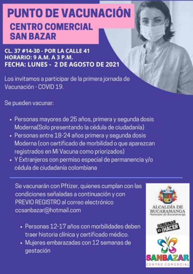 Instalaron un puesto en la calle 37 # 14- 30 (por la calle41) para recibir a quienes estén autorizados por el Gobierno Nacional. El equipo vacunador estará desde las 9:30 a. m. hasta las 3:00 p.m.