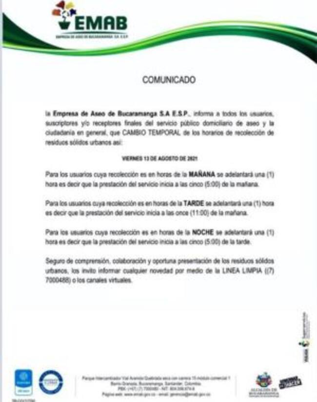 Finalmente, en Floridablanca se anunció que, las basuras se recogerán el viernes a las 10:00 a.m. en adelante.