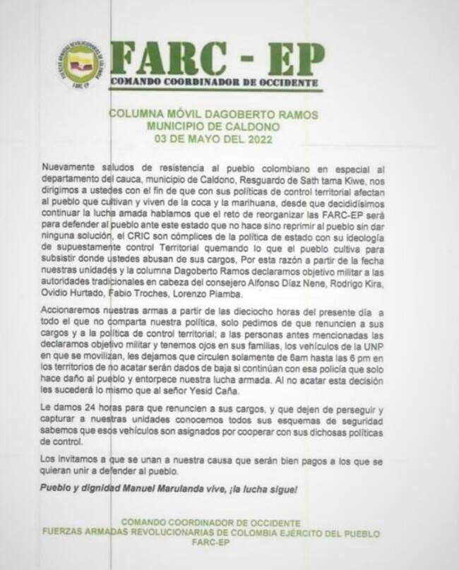 En el escrito, firmado por la estructura Dagoberto Ramos, son declarados objetivo militar el consejero mayor del Consejo Regional Indígena del Cauca, Cric, Alfonso Díaz Nene; así como Rodrigo Quirá, Ovidio Hurtado, Fabio Tróchez y Lorenzo Piamba.