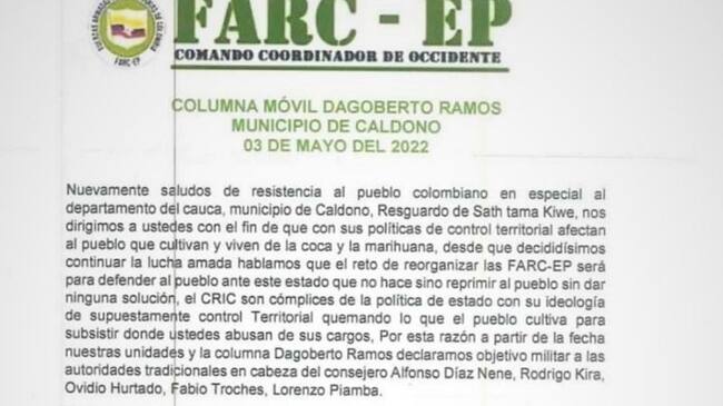 En el texto, los supuestos disidentes advierten que habrá acciones violentas y exigen que se detengan los controles territoriales por parte de la Guardia Indígena en contra de los cultivos de uso ilícito, coca y marihuana.