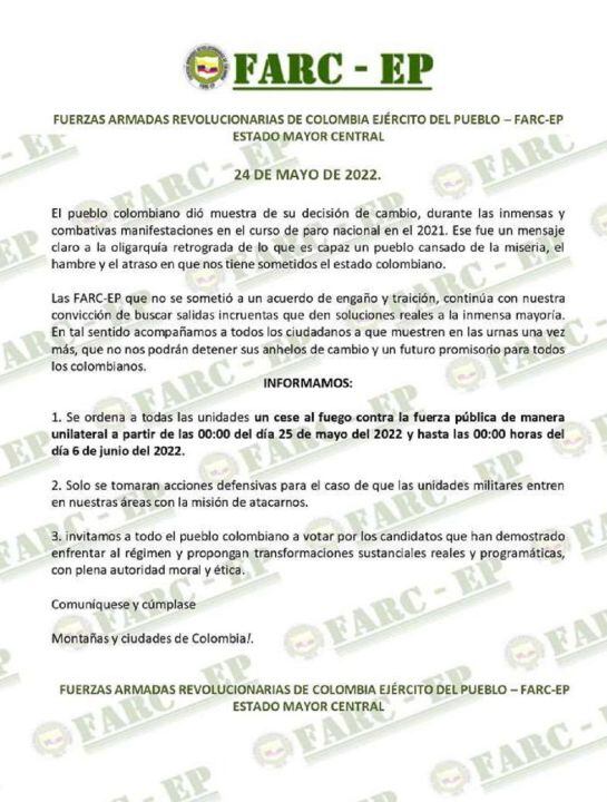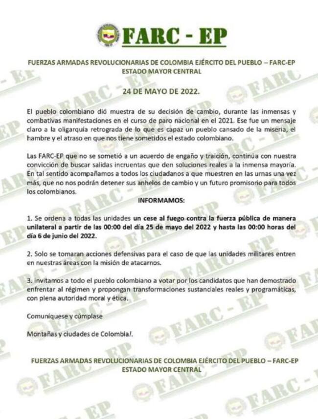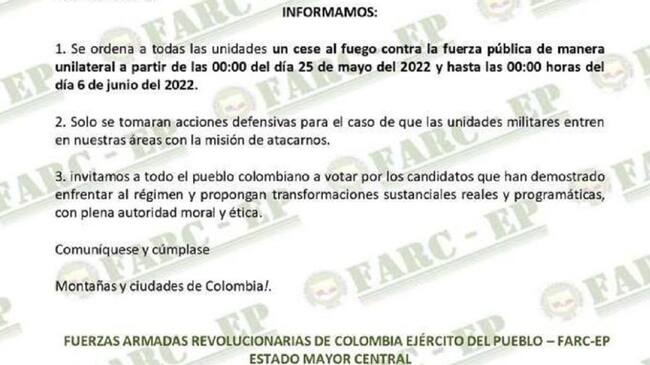 A través de un comunicado, el grupo armado al margen de la ley señaló que todas las unidades en las áreas donde tienen presencia, recibieron la orden de cese al fuego de manera unilateral a partir de las 00:00 de este miércoles 25 de mayo hasta las 00:00 del lunes 6 de junio de 2022.