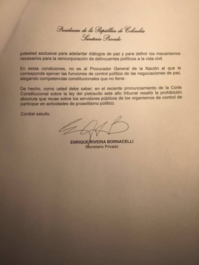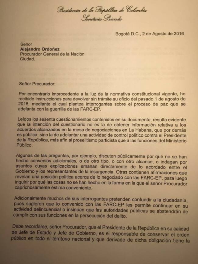 En carta enviada por el secretario privado de la Presidencia, Enrique Riveiria, por instrucciones del presidente, Juan Manuel Santos al procurador, Alejandro Ordóñez, le regresan el reciente cuestionario con 60 preguntas sobre el proceso de paz sin tramitar, afirmando que se trata más de un acto de proselitismo, que de ejercicio de las funciones del Ministerio Público.