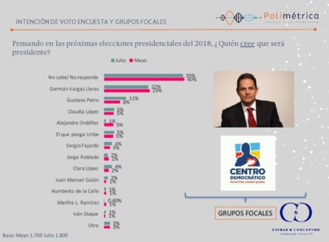 A 10 meses de las elecciones presidenciales de mayo de 2018, el ex vicepresidente de la República Germán Vargas Lleras y el ex alcalde de Bogotá, Gustavo Petro, encabezan la intención de voto, según la encuesta Polimétrica, realizada para Caracol Radio y Red Más Noticias por la firma Cifras & Conceptos, que dirige César Caballero.