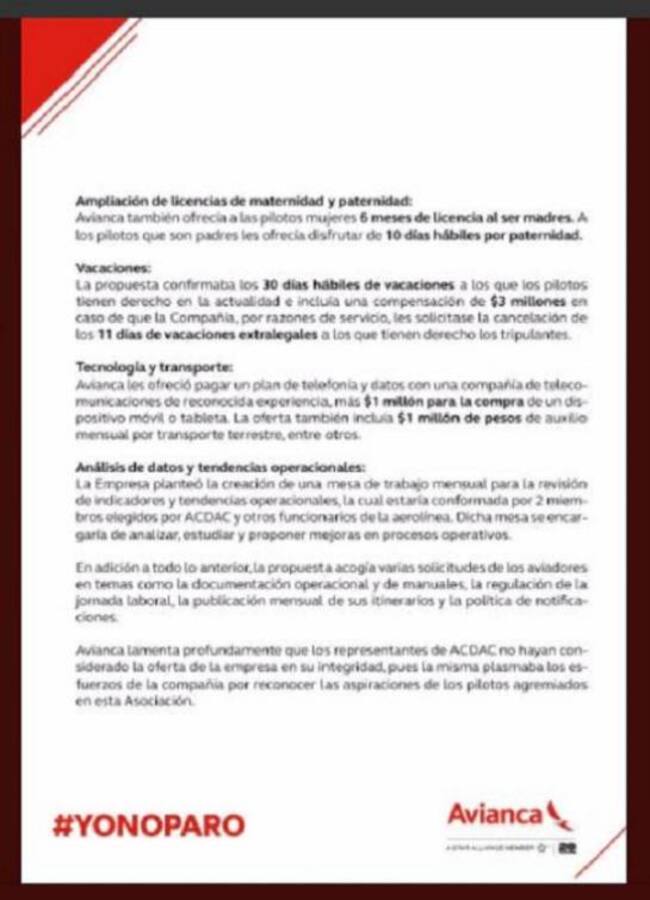 Vacaciones: La propuesta confirma los 30 días hábiles de vacaciones a los que los pilotos tienen derecho en la actualidad e incluye una compensación de $3 millones en caso de que la Compañía, por razones de servicio, les solicite la cancelación de los 11 días de vacaciones extralegales a los que tienen derecho los tripulantes.
