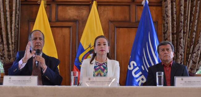 Juan Camilo Restrepo, jefe negociador del Gobierno; María Fernanda Espinosa, canciller de Ecuador y Pablo Beltrán, jefe negociador del ELN.