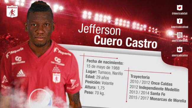 América de Cali oficializó la llegada del atacante Jefferson Cuero, jugador de 29 años que se entrena desde días atrás con el cuadro 'escarlata'. Finalmente, el cuadro vallecaucano logró un acuerdo con el Monarcas de Morelia, dueño de sus derechos deportivos, para que el jugador sea cedido durante un año.