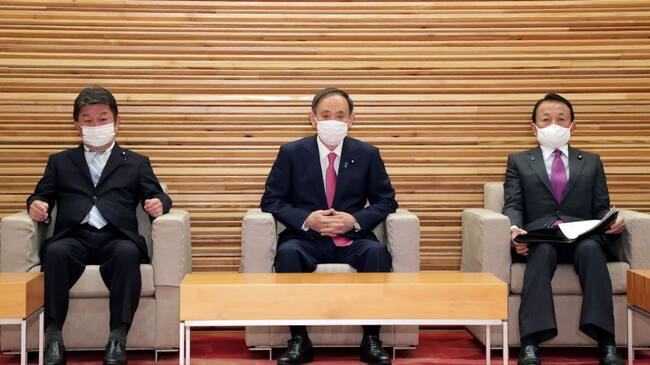 El primer ministro de Japón, Yoshihide Suga, el ministro de Relaciones Exteriores y el ministro de Finanzas,, asisten a una reunión del gabinete en Tokio el 22 de enero de 2021, ya que el primer ministro dijo que estaba "decidido" a celebrar el Tokio. Juegos Olímpicos después de un informe nocturno que afirma que los funcionarios creen que la cancelación es inevitable. / Getty Images