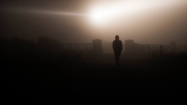 Asturias Spain, August 6, 2018: A mistery image of a girl walking to a fence in the fog at night. / Vanesa Ruiz Iniesta