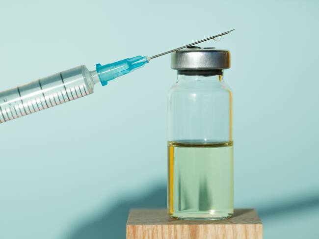 Clean syringe and sealed vial of liquid remedy placed on wooden cubes against blue background / Anna Efetova