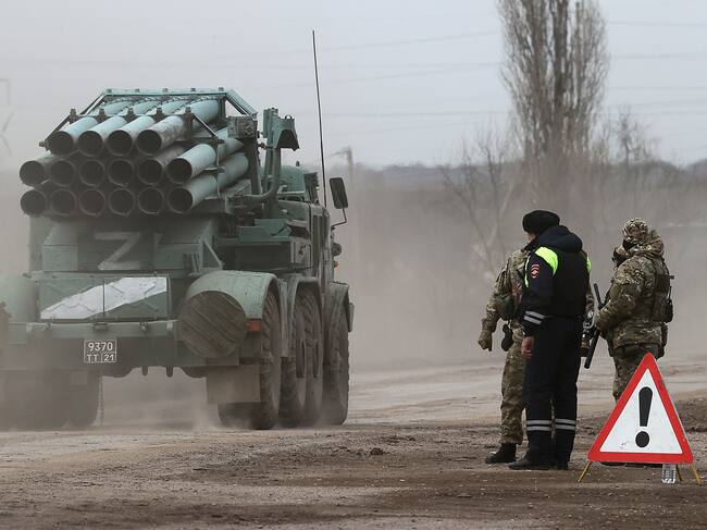 CRIMEA, RUSSIA - FEBRUARY 24, 2022: An armoured vehicle passes a police post in the town of Armyansk, northern Crimea. Early on February 24, President Putin announced a special military operation to be conducted by the Russian Armed Forces in response to appeals for help from the leaders of the Donetsk and Lugansk People's Republics. Sergei Malgavko/TASS (Photo by Sergei Malgavko\TASS via Getty Images) / Sergei Malgavko