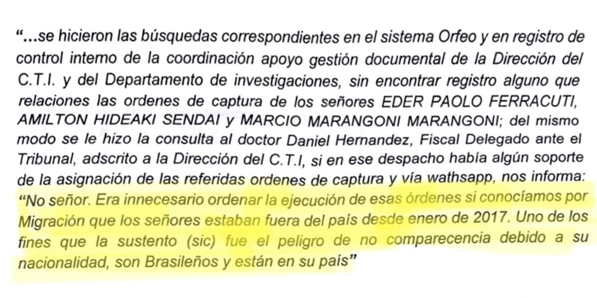 Esto, debido a que el informe del CTI de 81 páginas acredita que el fiscal Hernández no registró las ordenes de captura de los tres brasileños por el caso Odebrecht ni a la Policía Nacional, ni a Migración Colombia.