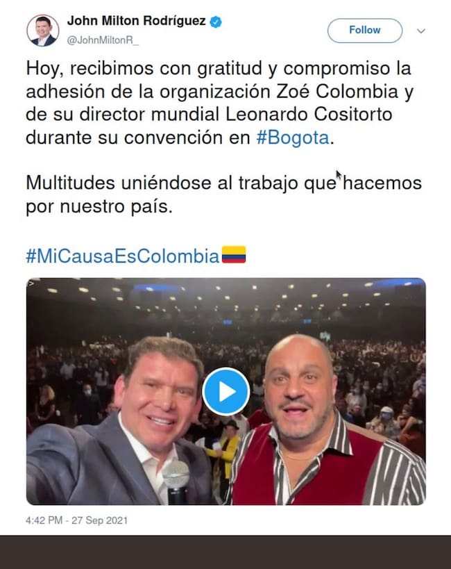 La W conoció una fotografía en la que aparece el candidato presidencial Jhon Milton Rodríguez, por el partido cristiano Colombia Justa Libres, con Cositorto.