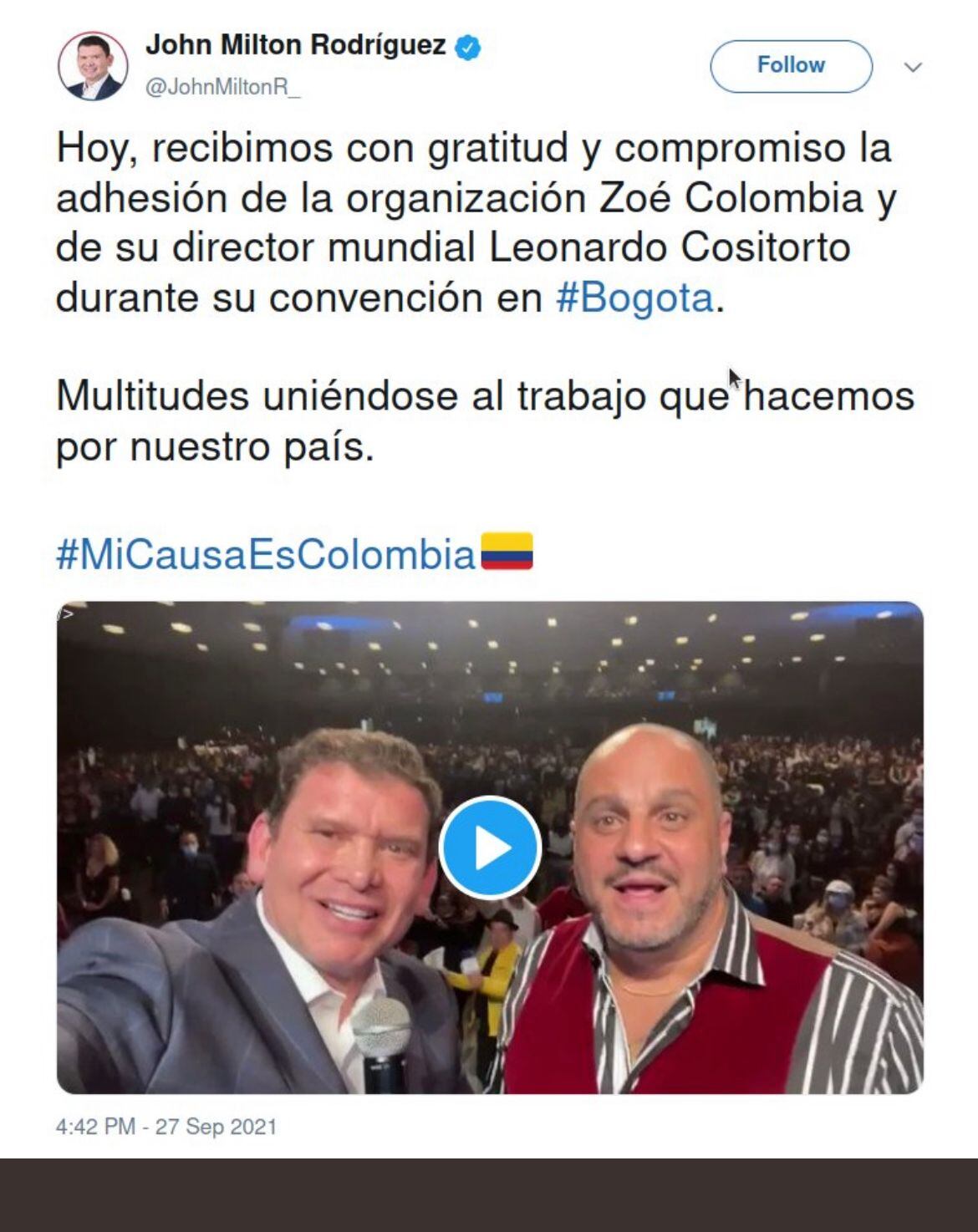 La W conoció una fotografía en la que aparece el candidato presidencial Jhon Milton Rodríguez, por el partido cristiano Colombia Justa Libres, con Cositorto.