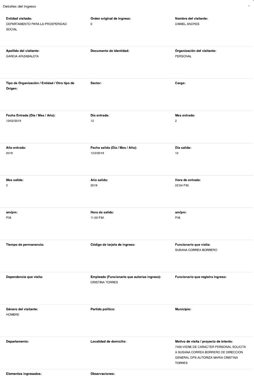 Y miren lo que son las casualidades. El Instituto Anticorrupción, que dirige Camilo Enciso, encontró visitas de García Arizabaleta al Departamento de Prosperidad Social en Bogotá y, específicamente, a la directora Susana Correa.