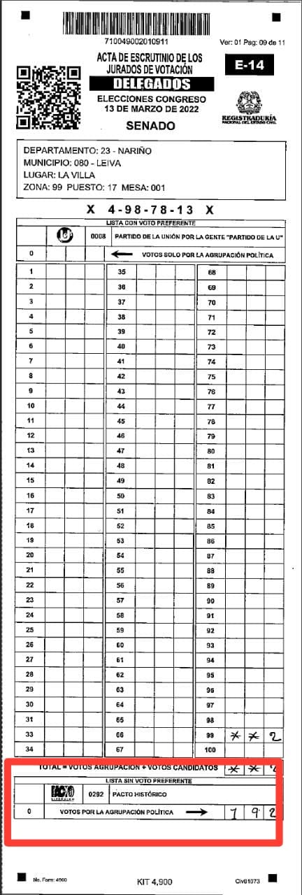Este año, por un diseño absurdo (como lo podrán ver ustedes a continuación), el Pacto Histórico –que es una lista cerrada– terminó viéndose como un pie de página del formulario que informaba la votación del Partido de la U que, por ser lista abierta, tiene los números de 1 hasta 100 y por eso ocupa más espacio en el papel: