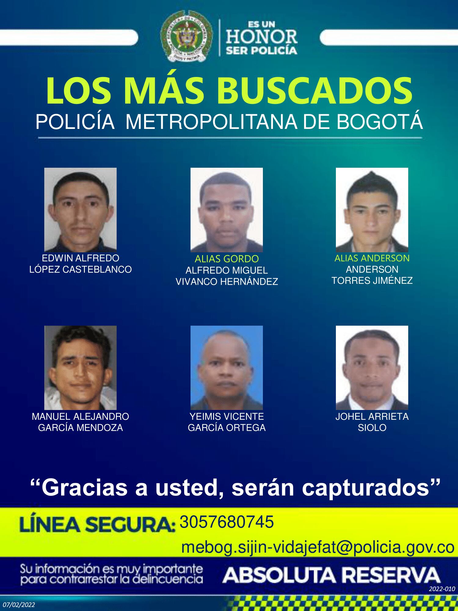 Así, la Policía dispuso de la línea segura 3057680745 y del correo mebog.sijin-vidajefat@policia.gov.co para quien tenga información que pueda conducir a la captura y judicialización de estas personas.