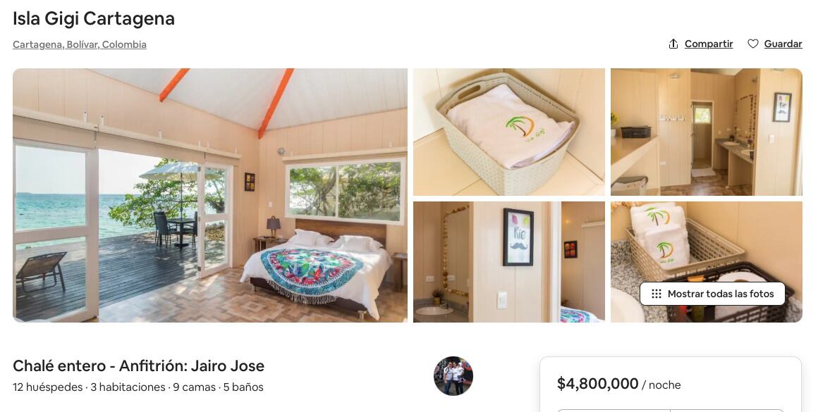 Según el portal Colombia Rents el valor de la noche es de: