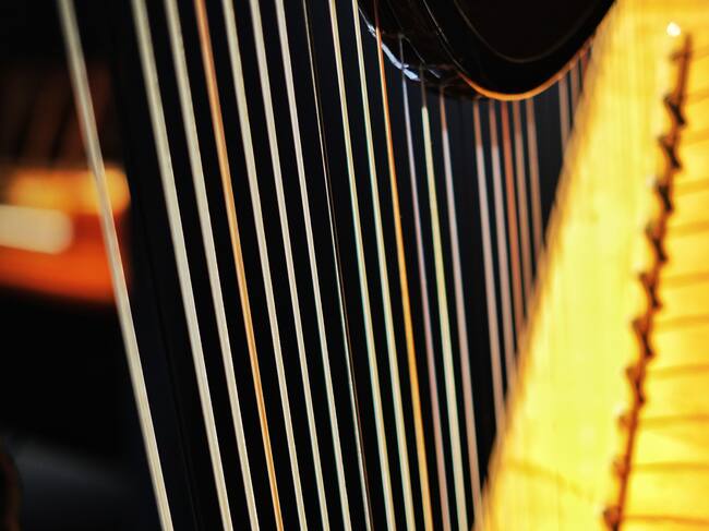 Ancient harp with the strings stretched in the foreground illuminated on a black background, music. / Stefano Madrigali
