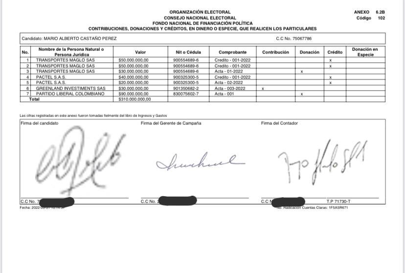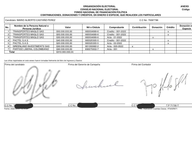 Por ejemplo, el Partido Liberal le donó $90 millones, mientras que la empresa Transportes Maglo S.A.S., dedicada al transporte de pasajeros, le donó $30 millones y le prestó $100 millones a través de un crédito. Por su parte, la empresa Pactel S.A.S., dedicada a actividades de servicios informáticos, le prestó $60 millones; y la empresa Greenland Investments S.A.S., dedicada a actividades de administración empresarial, le hizo una contribución por $30 millones.
