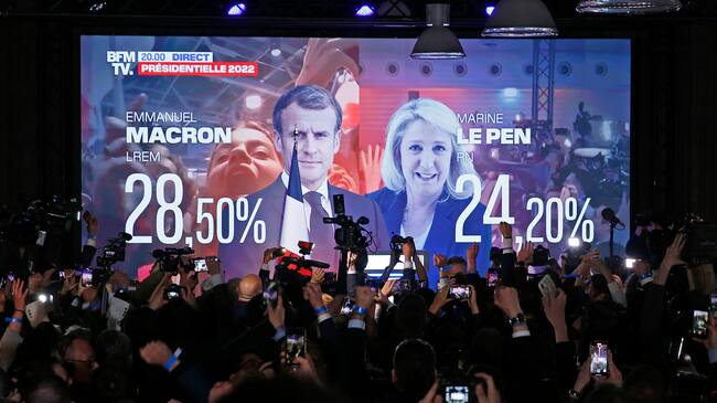 PARIS, FRANCE - APRIL 10: Faces of French President, Emmanuel Macron candidate for the 'En Marche!' (Onwards!) political movement and France's far-right party ‘Rassemblement National’ (RN) leader, Marine Le Pen candidate for the 2022 presidential election appear on a giant screen at ‘Pavillon Chesnaie du Roy’ on April 10, 2022 in Paris, France. According to projected results, French President Emmanuel Macron candidate for his re-election obtains 28.50 % of the vote and Marine Le Pen obtains 24.20 % of the vote in the first round of the presidential election. Emmanuel Macron received more votes than Marine Le Pen which means the two will now face each other in the next round of the French presidential elections on April 24, 2022. (Photo by Chesnot/Getty Images) / Chesnot