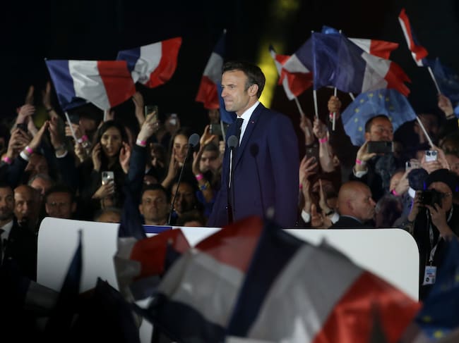 PARIS, FRANCE - APRIL 24: French President Emmanuel Macron celebrates his re-election at the Champ de Mars near the Eiffel Tower on April 24, 2022 in Paris, France. France's centrist incumbent President Emmanuel Macron beats his far-right rival Marine Le Pen in the presidential second round for a second five-year term as President. (Photo by Jean Catuffe/Getty Images) / Jean Catuffe