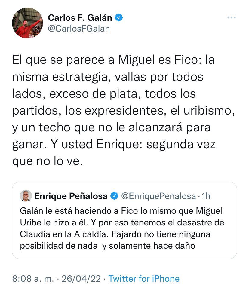 Al oído del rifirrafe entre Enrique Peñalosa y Carlos Fernando Galán. El exalcalde de Bogotá escribió en su cuenta de Twitter, y el líder del Nuevo Liberalismo contestó: