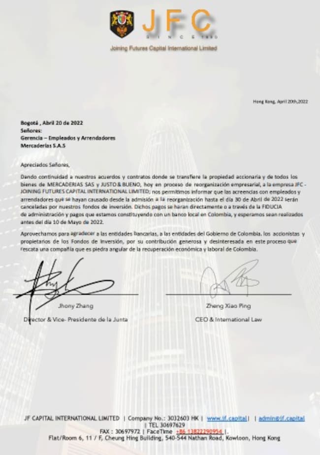 “Dando continuidad a nuestros acuerdos y contratos donde se transfiere la propiedad accionaria y de todos los bienes de Mercaderías SAS y Justo & Bueno, hoy en proceso de la organización empresarial, a la empresa Joining Futures Capital International Limited, las acreencias con empleados y arrendadores que se hayan causado desde la admisión a la reorganización hasta el día 30 de abril de 2022 serán canceladas por nuestros fondos de inversión. Dichos pagos se harán directamente o a través de la fiducia de administración y pagos que estamos constituyendo con un banco local en Colombia, y esperamos sean realizados antes del día 10 de mayo de 2022″.