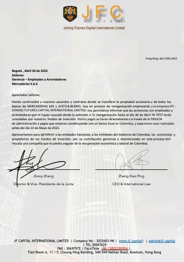 “Dando continuidad a nuestros acuerdos y contratos donde se transfiere la propiedad accionaria y de todos los bienes de Mercaderías SAS y Justo & Bueno, hoy en proceso de la organización empresarial, a la empresa Joining Futures Capital International Limited, las acreencias con empleados y arrendadores que se hayan causado desde la admisión a la reorganización hasta el día 30 de abril de 2022 serán canceladas por nuestros fondos de inversión. Dichos pagos se harán directamente o a través de la fiducia de administración y pagos que estamos constituyendo con un banco local en Colombia, y esperamos sean realizados antes del día 10 de mayo de 2022″.
