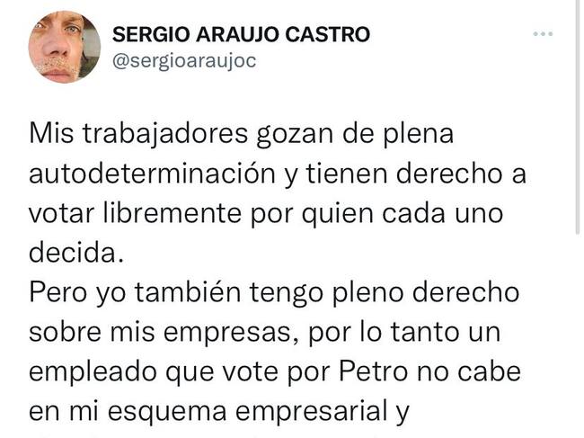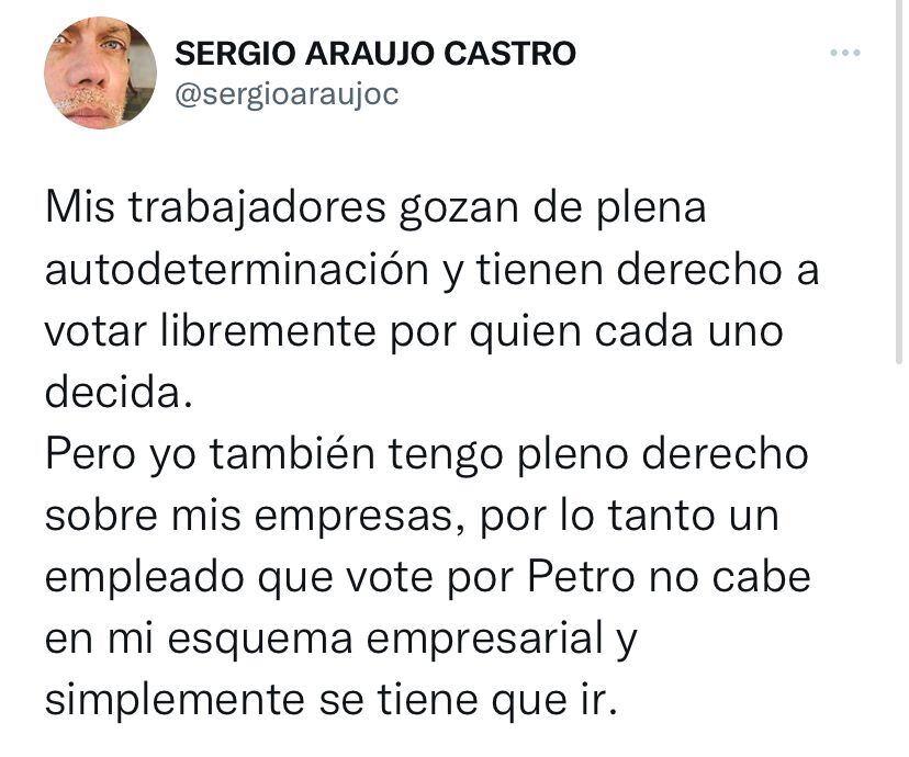 Polémica ha causado lo expresado por Sergio Araujo, quien aseguró que si un empleado de sus empresas vota por Petro lo despedirá.