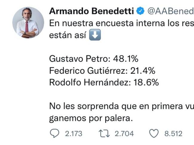El senador Armando Benedetti causó polémica en redes al revelar una encuesta interna, en la que los porcentajes de los tres primeros serían: