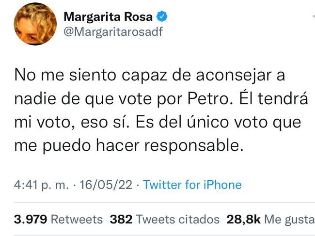 “No me siento capaz de aconsejar a nadie de que vote por Petro. Él tendrá mi voto, eso sí. Es del único voto que me puedo hacer responsable”, señaló Margarita en su cuenta de Twitter.