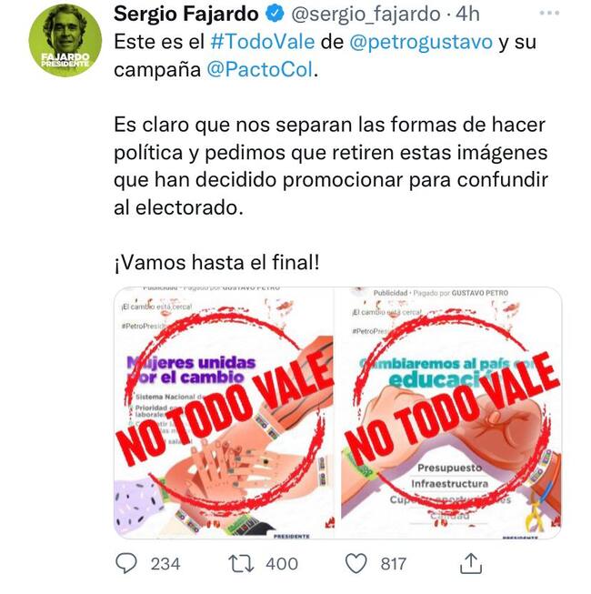 El candidato Sergio Fajardo denunció en redes que en una publicidad paga de Gustavo Petro se usaba también publicidad del candidato de la Centro Esperanza, recordándole que “no todo vale”.
