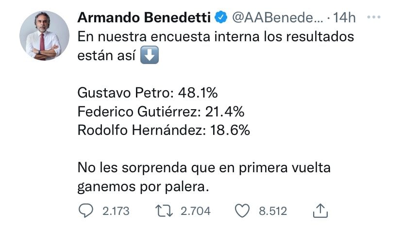 El senador Armando Benedetti causó polémica en redes al revelar una encuesta interna, en la que los porcentajes de los tres primeros serían: