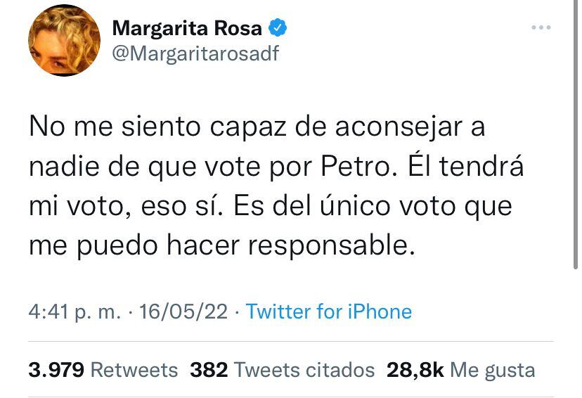 “No me siento capaz de aconsejar a nadie de que vote por Petro. Él tendrá mi voto, eso sí. Es del único voto que me puedo hacer responsable”, señaló Margarita en su cuenta de Twitter.